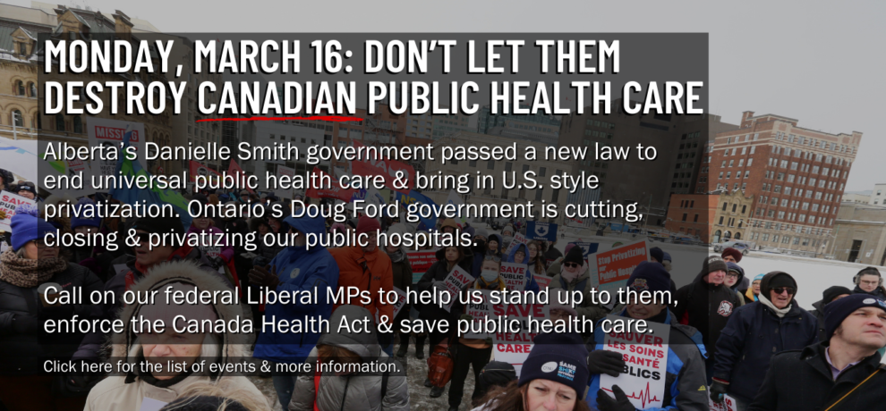 (March 6, 2026) Don’t Let Them Destroy Canadian Public Health Care Monday, March 16 Alberta’s Danielle Smith government passed a new law to end universal public health care and bring in U.S. style privatization. Ontario’s Doug Ford government is cutting, closing and privatizing our public hospitals. Call on our federal Liberal MPs to help us […]