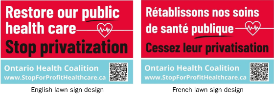 As we head into the summer, we are building the fightback against health care privatization and putting out lawn signs across Ontario (see designs below). We have sent out 5,000 signs to local coalitions across the province and will order more if we are able to afford it. We are working to put up as many as possible to show visible opposition to the privatization of our public health care.
