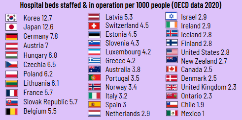 NOTE: A “hospital bed” means a bed that is funded with nurses, doctors & other staff providing care. When they close down “beds” it means they cut staff & the care they provide. Patients are backlogged in emergency departments because they are waiting for a funded bed to open up for them inside the hospital, while thousands of beds have been closed down & could be reopened.