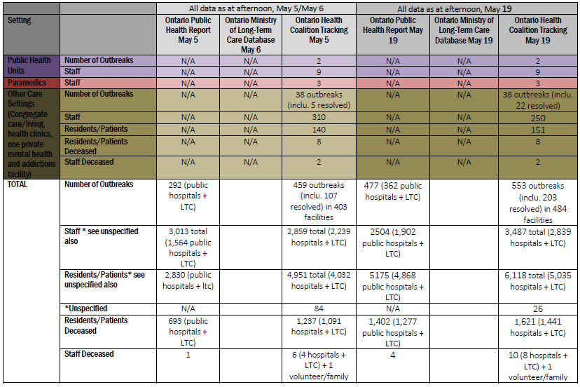 Here are the key findings from the most recent tracking contained in this report of cases in health care settings across Ontario up to the afternoon of May 19: