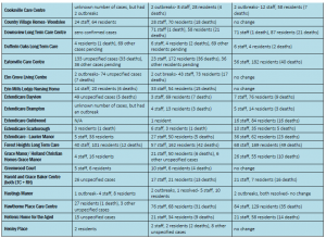 Each number included in this tracking data represents a human being who is loved and who has experienced the terrible toll of COVID-19: staff who have gone to work despite the risk and the fear; residents and patients who have contracted COVID-19; families and communities who have lost their loved ones; staff who have made the ultimate sacrifice. You are in our hearts. To the media, the Public Health and Ministry staff who have been tracking and compiling this information for public scrutiny, thank you for your work. To all of you, we give our commitment to advocate to the best of our ability and to do everything we can do for the best protection and care for all affected.